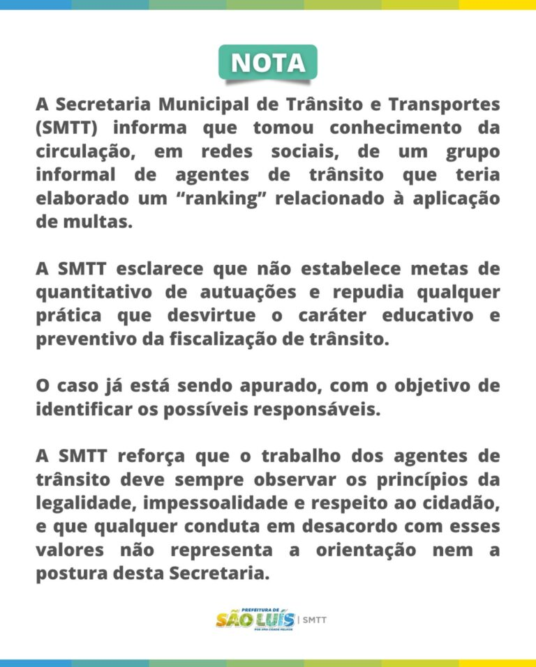 A Secretaria Municipal de Trânsito e Transportes (SMTT) de São Luís informou, por meio de nota oficial, que está apurando a veracidade de informações que circulam nas redes sociais sobre a criação de um suposto “ranking” informal de aplicação de multas por parte de agentes de trânsito da capital maranhense.